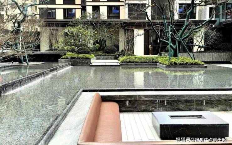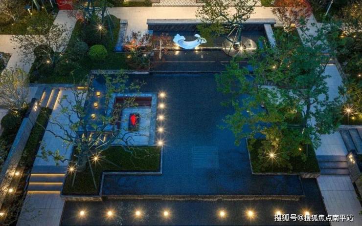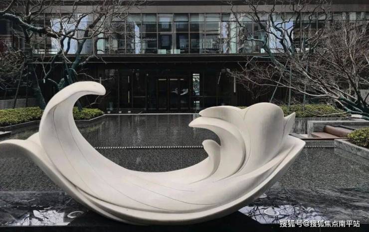 二进——社区大堂 + 芙蓉水院:200㎡镜面水景,汉白玉芙蓉雕塑,精品乔木列植,形成视觉焦点;