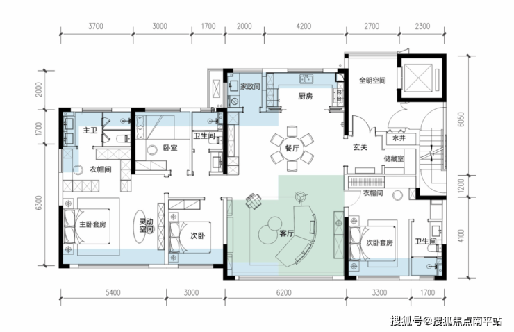 143㎡四房三卫,得房约112%(含电梯厅),套内约152㎡,南向面宽19.2米,5开间朝南,62,4㎡一体化客餐厅,客厅开间6米,双套卧+三卫全明,采光、通透、实用性拉满。