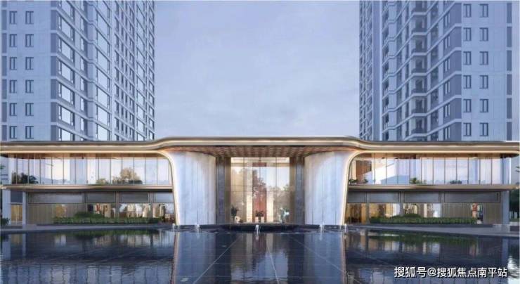 一进——酒店式落客大门:约 70 米宽门庭,暖色石材 + 流线金属挑檐,两侧水景与名贵乔木;