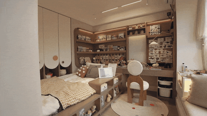 次卧实现多功能均衡,定位家庭加油站,可以作为阅读、办公以及收藏兴趣爱好的空间。