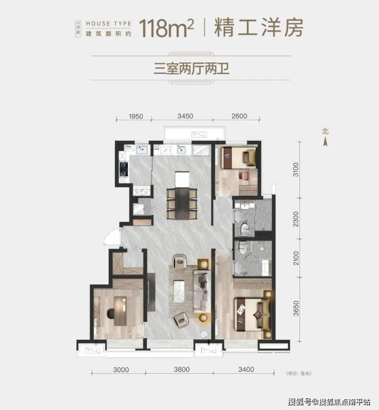 至于建面约118㎡的三室两厅两卫洋房户型,则可以匹配改善客群的需要。