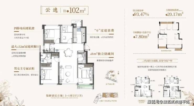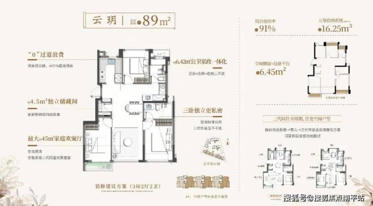 璞云主力户型82-113㎡,大胆的纯洋房设计+全飘窗、设备阳台赠送,让综合使用率十分惊艳:89㎡3房2卫,得房率约91%;102㎡户型得房率约93.5%;112㎡户型得房率约92% ,比起高层同等建筑面积户型,实际使用空间秒杀。比如璞云89㎡洋房,按得房率反推,相当于市场上高层100-116平三房。
