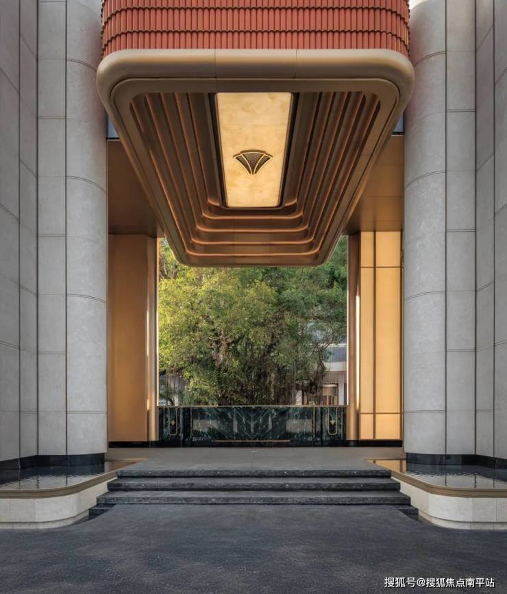 步入4米宽的归家走廊,外侧可以看到百年榕树与榕树广场的盎然绿意,静谧自然的氛围扑面而来。内侧以透光石材吊顶与装饰墙面营造奢雅质感。回望10米高的门头,空间的序列感与仪式感相互交织,构筑出温馨而尊贵的归家体验。