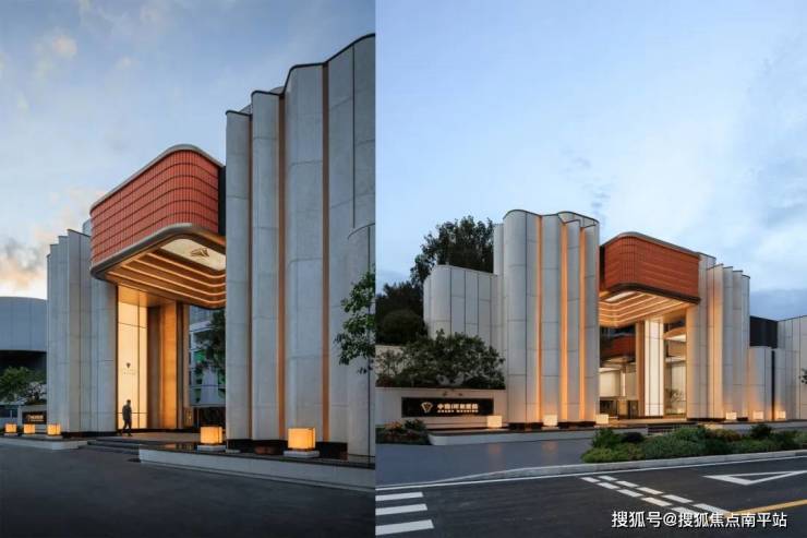 高耸入口两侧如屏风般徐徐展开,既是对传统礼序的回应,也通过体块的转折形成含蓄而有层次的界面,悄然引导视线的延伸。