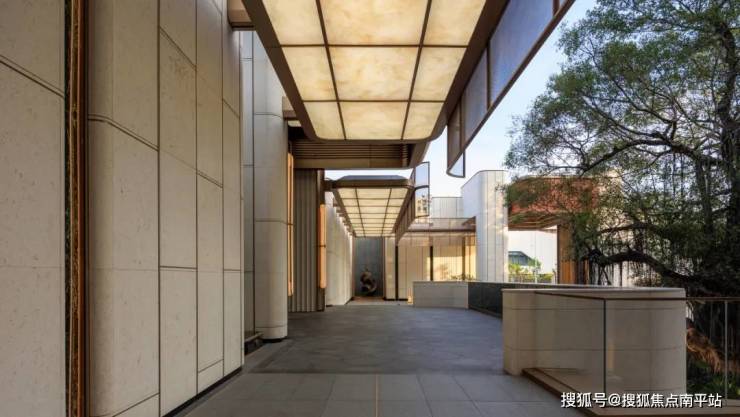 步入4米宽的归家走廊,外侧可以看到百年榕树与榕树广场的盎然绿意,静谧自然的氛围扑面而来。内侧以透光石材吊顶与装饰墙面营造奢雅质感。回望10米高的门头,空间的序列感与仪式感相互交织,构筑出温馨而尊贵的归家体验。