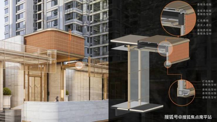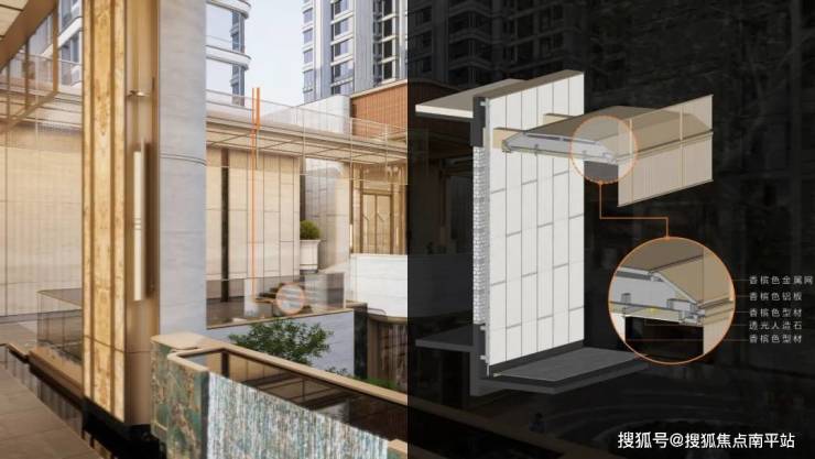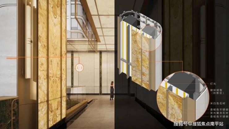 本项目精心选用了体现在地性的石材,辅以不锈钢及铝板做细节线条设计。在主材构造、尺寸把控、去胶化、密拼工艺、弧形造型的落地,严抠交接,坚持材料的完整性等维度都给与高度关注。
