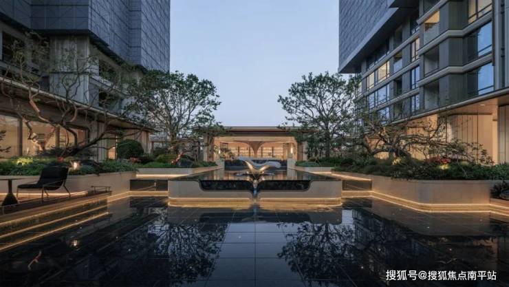 第二进庭院位于榕树广场与大树书吧之间,庭院通过水景与绿植的结合,为艺术柱廊营造出静谧的氛围。中央水池的反射与两侧灯光路径相呼应,增强了空间层次感与引导性,提供了一个既安静又具流动感的休憩空间。