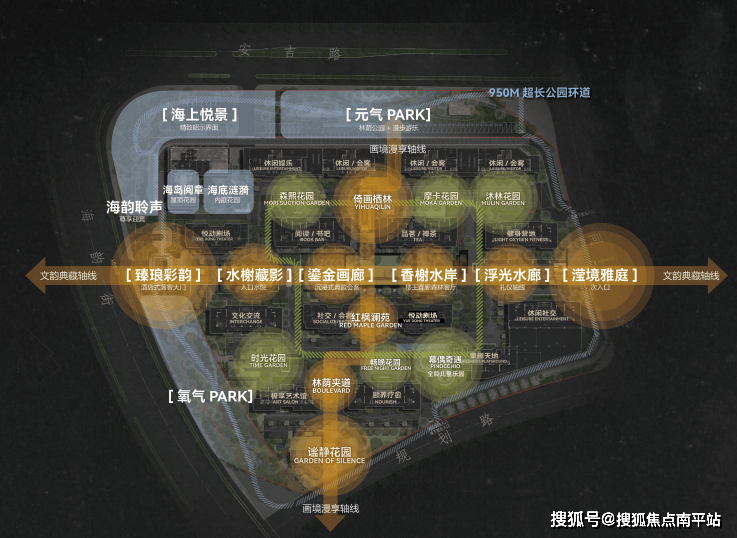项目以数千万级匠造投入,邀约国际景观大师与非遗传承人共同设计,融汇在地文化和摩登腔调,打造约5万㎡创新展馆式园林,营造出涵盖“一带·两轴·一环·六园·十一馆”的沉浸式自然聚场。