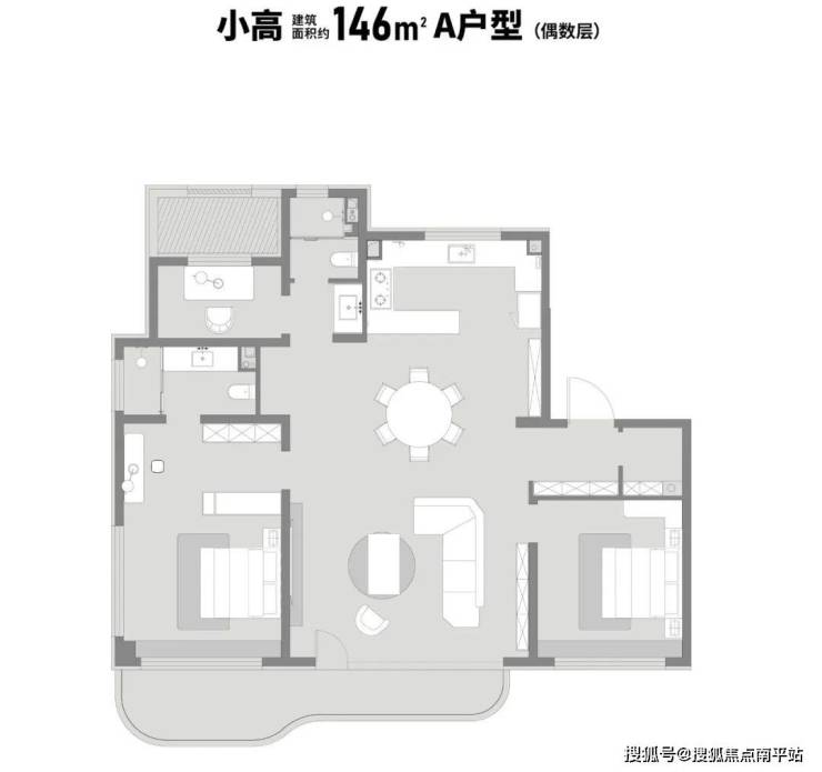 户型主要分为三款:建筑面积约120㎡、146㎡全能三室和建筑面积约186㎡奢阔四室。