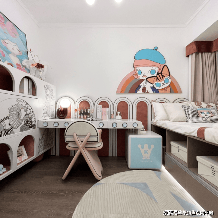 女孩房以泡泡玛特DIMOO水族馆为主题,打造解放儿童天性的独特个性生活空间。马卡龙粉色与蓝色对撞出活泼可爱的调性,主题雕塑挂画,摆件增加记忆亮点。台面上摆放有各种水精灵,独一无二的小飞鱼、圆滚滚的企鹅、头部云朵采用特殊温感设计的北极熊、古老航海家海龟、被誉为自然界顶级伪装高手的章鱼.....小小台面,仿佛收纳了一个童话水世界。