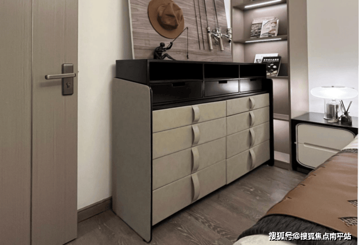 次卧以黑白灰搭配琥珀色,体现沉稳大气的休憩氛围。作为老人房,特别设置展示父母垂钓爱好的渔具摆件,闲暇时还可端坐于飘窗翻看各类钓鱼书籍,颐养天年好不惬意。