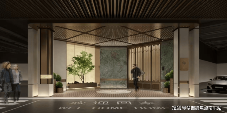 地上归家流线:街角艺术口袋公园——星光迎宾大道——滨河四季花汀——新南洋生活美学馆——风雨连廊(园林归家路)——主题架空层——单元门头——室内大堂——首层电梯厅——标准层电梯厅;