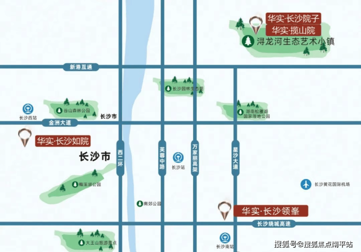 项目扼守城市东西交通主干道——岳麓区金洲大道(桐梓坡路西沿线),接市府、承高铁西,连梅溪湖副中心。距地铁2号线西延线二期金洲大道站(在建中,预计于2025年试运行)约650米。“三横三纵”主干道路网,长宁快线、长浏快线城轨等多维立体交通接驳全城。