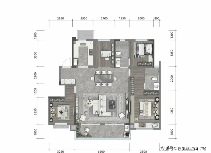 4+1房设计,大横厅开间约8米,如此尺度在别墅和洋房里非常少见!约17.8m南向超大面宽!约16㎡跑道式阳台!市场罕有3套房设计,南向主卧套房开间近5米,带独立的全房式衣帽间!