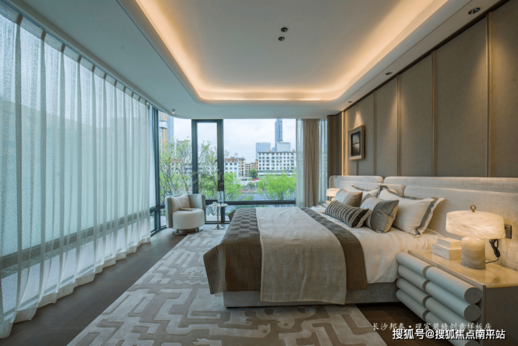 270°全景舱主卧:环幕落地窗直面湘江天际线,步入式衣帽间+双台盆卫浴彰显奢适;