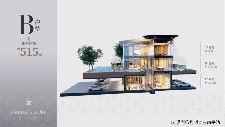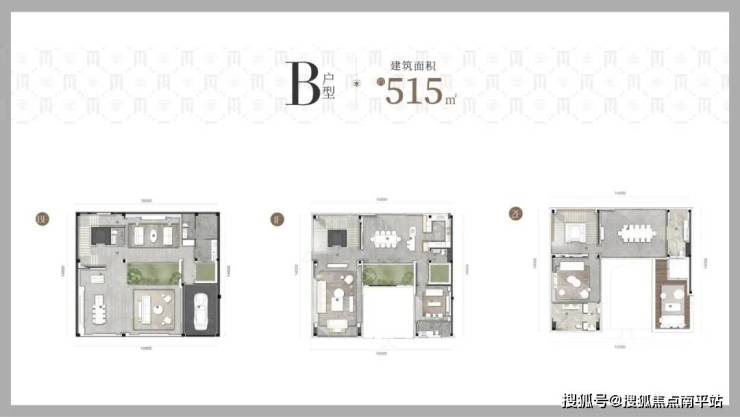 B 户型建筑面积约 516㎡,使用面积约 560㎡,花园面积约 37 - 219㎡,独立车位入户,总价 3000 - 3500 万。室内空间宽敞,一二层层高各 4.5 米,负一层层高 5.4 米,面宽 16 米,提供顶奢级空间感,结合前庭后院的 U 字合院布局,每户都是独立围合庭院,室内设计由梁志天先生操刀,融合亚洲文化、艺术元素及现代风格,打造完美的空间运用、色彩搭配和光线配比。