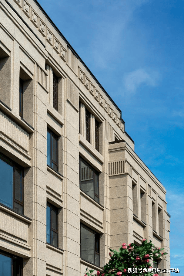 简约、舒展的线条,勾勒建筑肌理,建筑廊檐对标天津五大道的法国浪漫建筑情怀,将传统“孟莎式”的双坡屋顶与现代美学风格融合,并进行创新优化,营造棱角分明的庄重素雅之感。