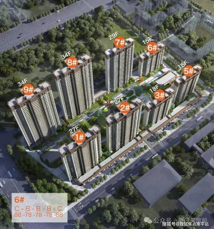 在售1#(27#)3梯6户、5#(18F),6# (15F)2梯5户、主推9#(34F),3梯6户。