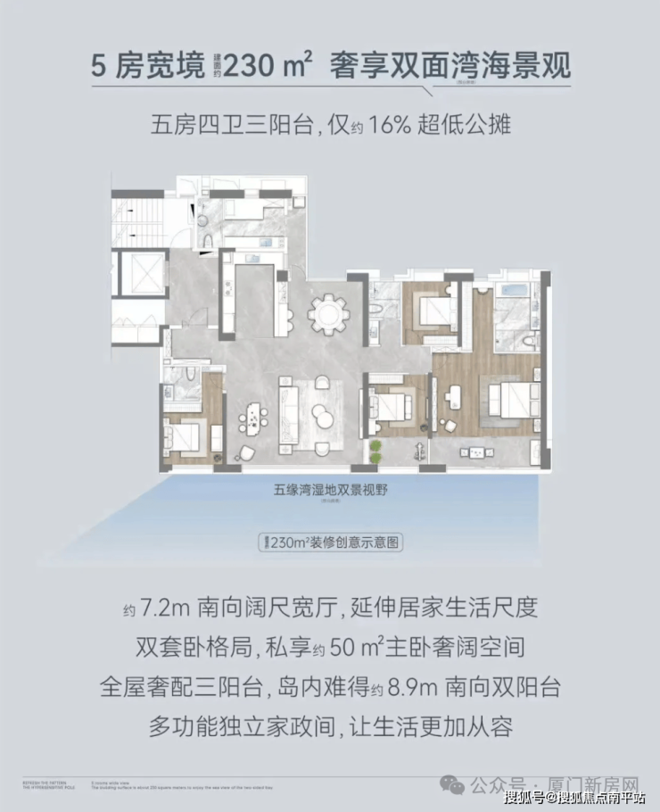 也是目前岛内唯一一个200多平做5房的产品,户型方正,独门独户,公摊只有16%,7米左右面宽的景观客厅,50㎡的豪华主卧,还带3个阳台