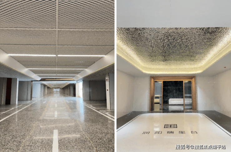 »精装艺术车库:按照长沙顶豪标准,打造精装车库,高档水磨石地面,铝拉网+铝方通艺术吊顶,墙柱采用特级岩板,归家仪式感。