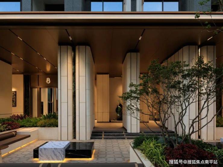 艺术柱廊通过宽敞通透的空间设计,结合顶级月光米黄石材打造的立柱与绿植,创造出既私密又开放的休憩区。精心布置的座椅为住户提供了一个舒适的社交与休闲空间,提升了整体居住体验。