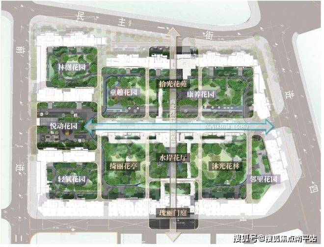 小区整体空间布局上采用:南北中心景观轴,东西邻里中心休闲轴,两道主要景观轴线,依托围合式住宅格局,充分利用超大尺度景观空间,打造「一庭两轴十花园」的主题园林景观。