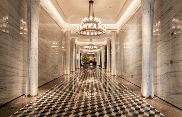 尤为重要的是,所有这些石材均为 A级料 。在业界,这意味着顶级酒店与艺术馆级别的甄选标准。十大世界知名设计师联袂,将如此规格与数量的珍稀石材汇聚于一处住宅大堂,近乎一种偏执的宣言。