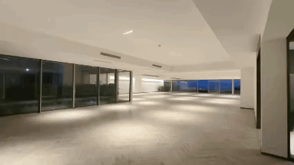 没有预设的隔墙,没有遮挡视线的结构柱 ,只有四面通透到底的落地玻璃,以及那道 长达约17.4米的巨幕阳台 ,将室外的天光湖色毫无保留地引了进来。
