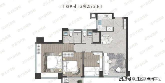 高层建筑面积约 82、89㎡三房户型,突破小面积只做中间套限制,实现了边套的三面通透采光, 户型的综合使用率约86%。相当于 花80㎡的购房款,享受市面上超100㎡户型的空间尺度感。