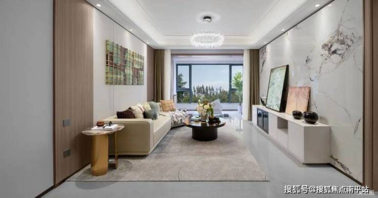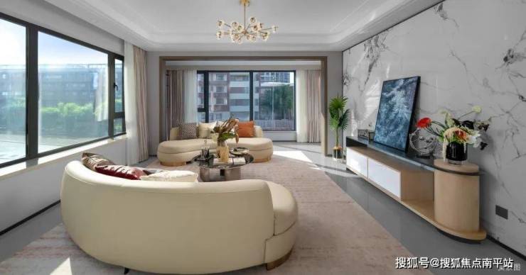 颜值墙面:电视背景墙采用整面大理石岩板铺贴,沙发背景墙采用木饰面+布艺硬包,主卧背景墙布艺硬包