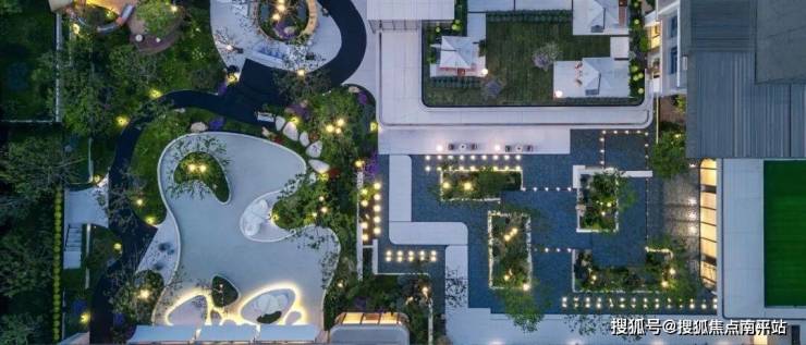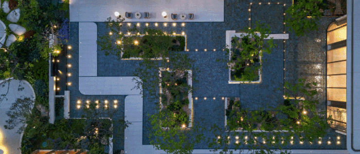 示范区内部情景设计以川西林盘的自然形态为线索,打破单调的围合模式,将配套功能拆解于尺度宜人的小体量盒子,嵌入到树林之间,呈现自由且松散的状态,形成丰富的林盘聚落空间系统,通过建筑与自然环境的融合共生,营造松散、闲适、惬意的烟火场景,从而回应在地客群的生活方式需求。