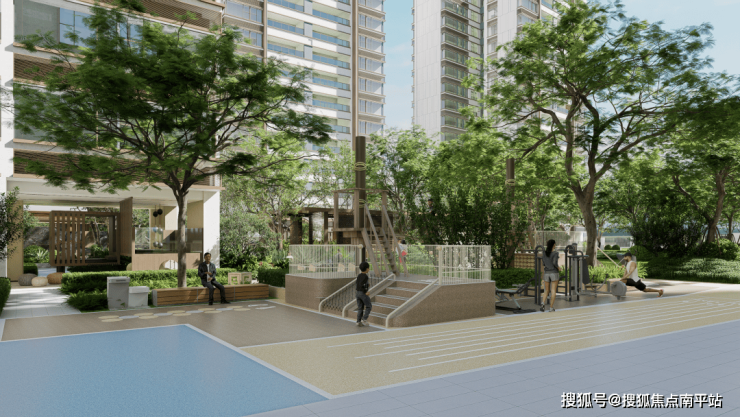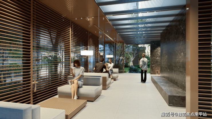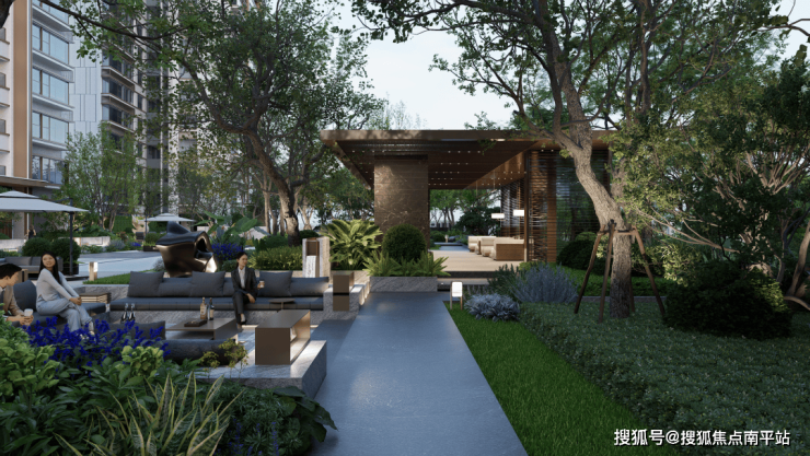 设置精致的酒店式花园会客厅,以自然为背景,打造一处静谧会客厅,附近还规划有会客水院和休闲花园等功能区,在特选朴树和周围在花境的烘托下,打造独有的专属私人休闲功能区。会客厅采用格栅围合而成的连廊,布置茶几、沙发,这里休息、会客、洽谈回归慢生活,享受友好和谐的社区氛围,增加邻里沟通交流。