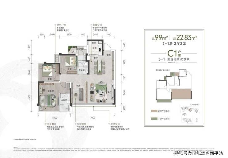 ▋明星户型:建筑面积约99㎡ 3+1房两厅两卫 可拓展面积22.83平米 得房率约106%