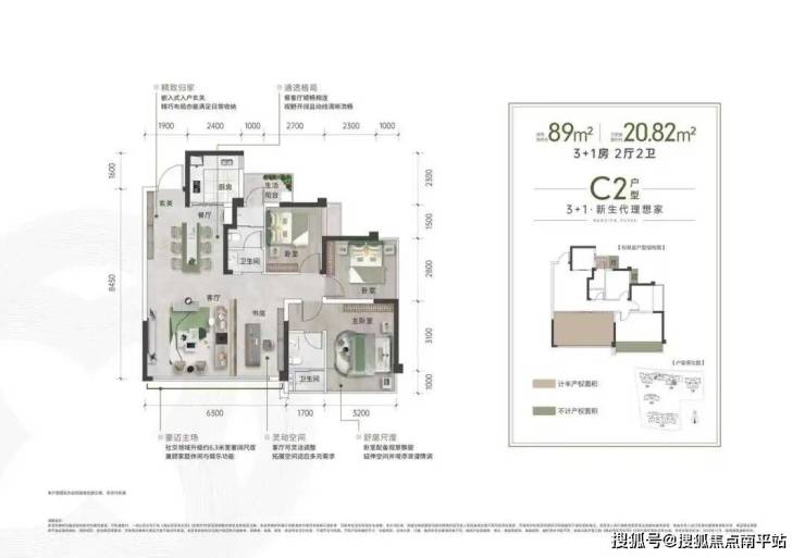 ▋爆款户型:建筑面积约89㎡ 3+1房两厅两卫 可拓展面积20.82平米 得房率约106%