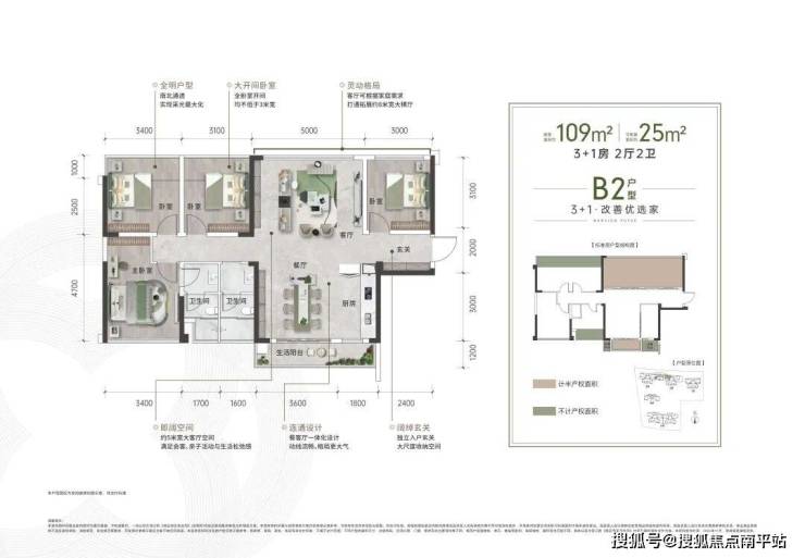 ▋王牌户型:建筑面积约109㎡ 3+1房两厅两卫 可拓展面积25平米 得房率约106%