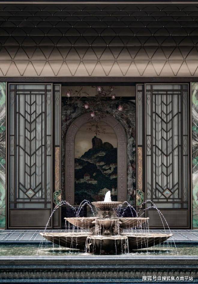 庭院空间采用创新的三重嵌套设计,精心构建出三种截然不同的情绪氛围。中心庭院的天花透光拼花窗格随日影变换,为在此交流的居民投射出斑斓光影,营造出梦幻而浪漫的氛围;凤凰廊架后方的紫藤花境,以自然植被打造出充满诗意的浪漫意境;而对称设计的狮头涌泉,则带来静谧而优雅的氛围,为居民提供一个宁静的休憩空间。