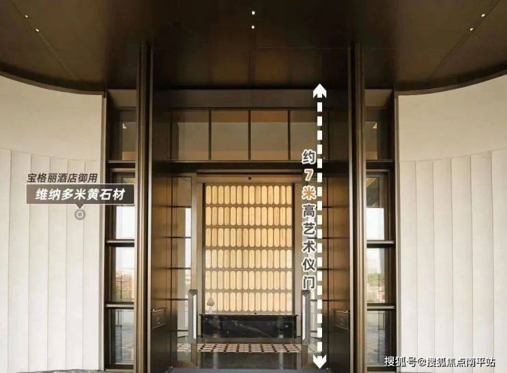 一进大门,整个入户大堂以宝格丽酒店设计风格为灵感,每一个细节都透出映射质感。约7米高的艺术移门辅以奢石弧形墙面,以强烈的仪式感,勾勒通往越秀·万博和臻的“玄关”。