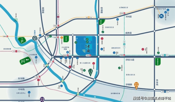 【路网】:四横四纵路网,四条横向主干线为卫国道、成林道、津滨大道、津路;四纵为红星路、中环线(顺达路)、快速路、外环线,这样的一个立体交通路网下,您能够与城市各个区域做自由切换。