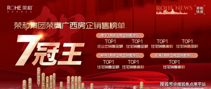 7月,荣和集团 荣膺广西房企销售榜单七冠王,其中,荣和集团在 南宁7月房企权益销售排行: 全业业态销售金额 TOP1、住宅销售金额TOP1、住宅销售套数TOP1、住宅销售面积TOP1; 柳州7月房企权益销售排行: 住宅销售金额TOP1、住宅销售套数TOP1; 北海7月房企权益销售排行住宅销售套数TOP1。持续霸榜楼市的销冠,以荣誉铸经典,以佳绩争荣光。