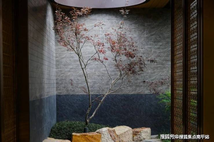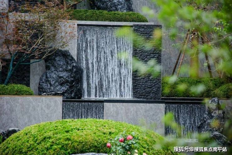 叠水如瀑,搭配层次丰富的景观植被,还有黑山石置石,将东方传统以当代语境焕新演绎。
