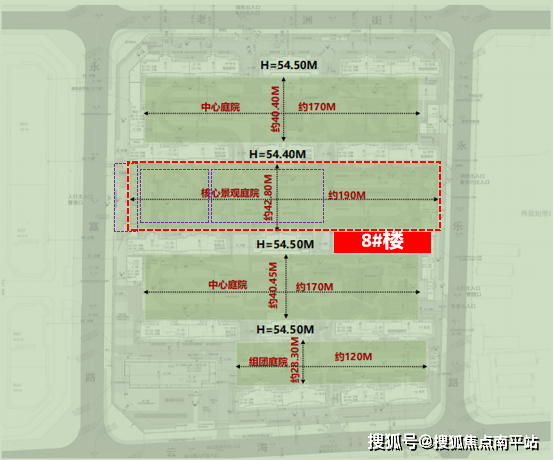 8#楼北侧横向为小区核心景观轴,长度约190米,楼间距最大约42.8米,都是小区之最。且这条轴线上布局了建发引以为傲的三进制归家礼序,多重景观庭院与2000㎡下沉飞瀑会所,以及最多的架空层休闲空间。这些“近水楼台先得月”的配套便利,将在日后的社区生活中带给业主长久的美好体验。