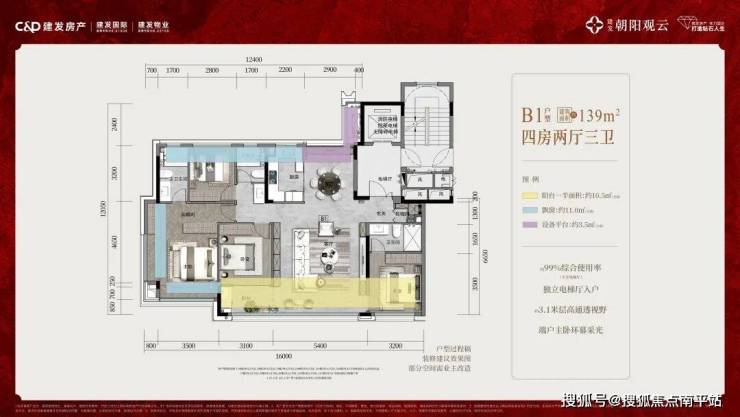 ◦ 139㎡大平层:(不含电梯厅)最高接近100%的综合使用率,层高约3.1米,正4房3套卧,独立电梯厅入户,约40㎡双景客餐厅+约8.5米宽阳台+5.4米大客厅,通透实用;