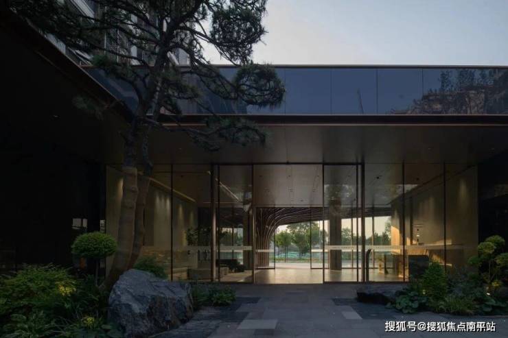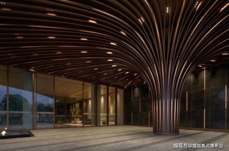 社区入口挺拔树立着如同生命之树的立柱,以钢为骨,与大面积金属铝板屋顶结合,一体化的设计一直延伸至社区大堂,将室内、景观和建筑相互融合。