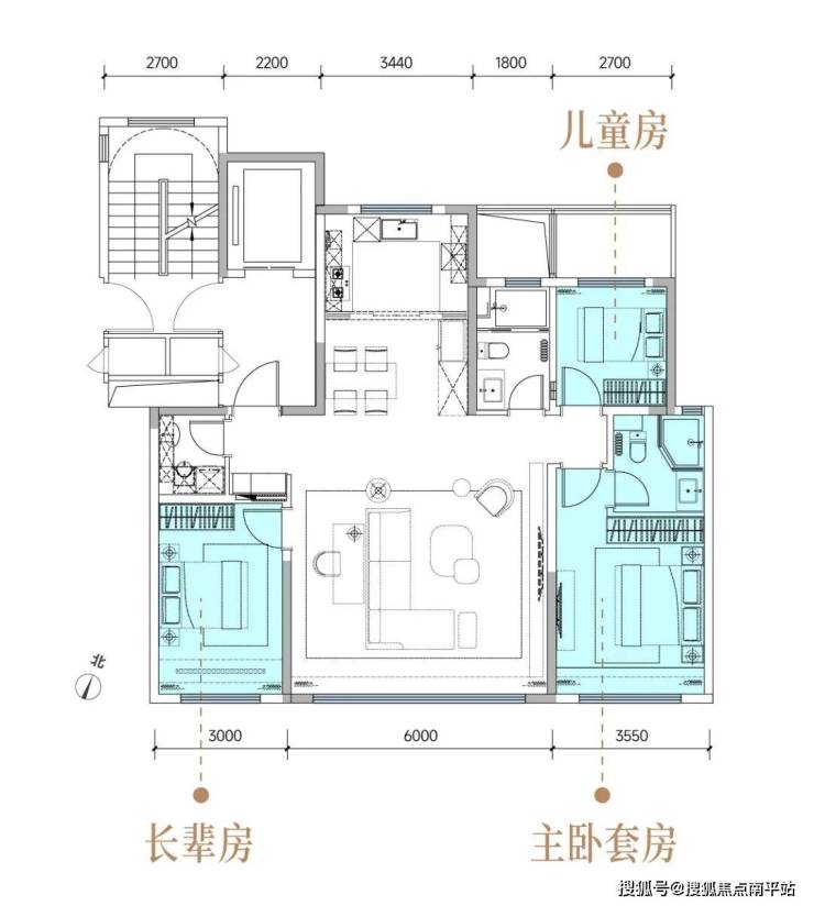 儿童房与主卧相对独立又相邻,方便照看。南向阳光长辈房,紧邻起居区又远离其它卧室,满足老人白天爱热闹的心情,又能保障夜晚休息不被打扰。主卧套房内设独立明卫,约3.55米的空间感,无需在功能性与舒适度之间纠结取舍。