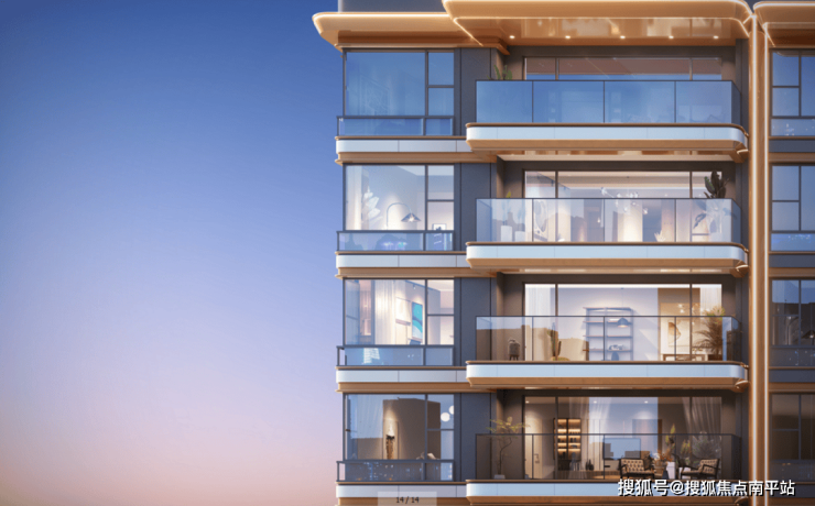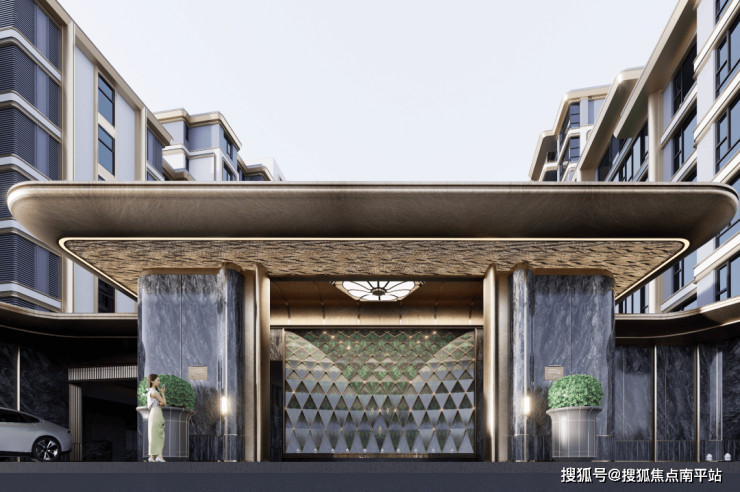 洋房建筑风格是经典的香槟金色铝板框线与大面积落地窗风格,开敞阳台底部用大面积香槟金铝板形成弧线包围结构,线条圆润,色彩对比会凸显高透玻璃带来的通透感。 顶部阁楼的老虎窗很有传统花园洋房的体验,在追求极简灰白平直的年代,这个略带复古的都会风格更符合传统审美。坡屋顶让整个建筑看起来会更加稳重大方,而不是一个单调的平板,门头的细节精致,层间材料复杂,色彩明快,很有些老钱风范。
