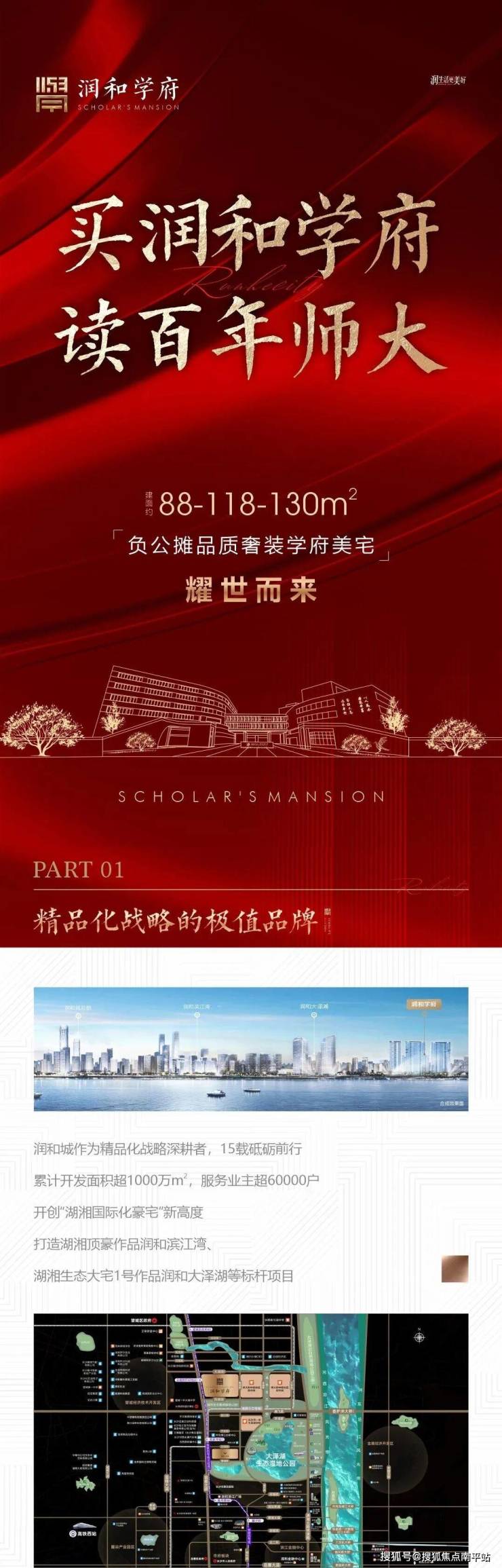 润和学府位于大泽湖片区金星北路与西塘路交叉口东北角,占地面积约3.8万㎡,总建筑面积约14万㎡,是由润和打造的望城首个地铁直通地下车库的教育社区。