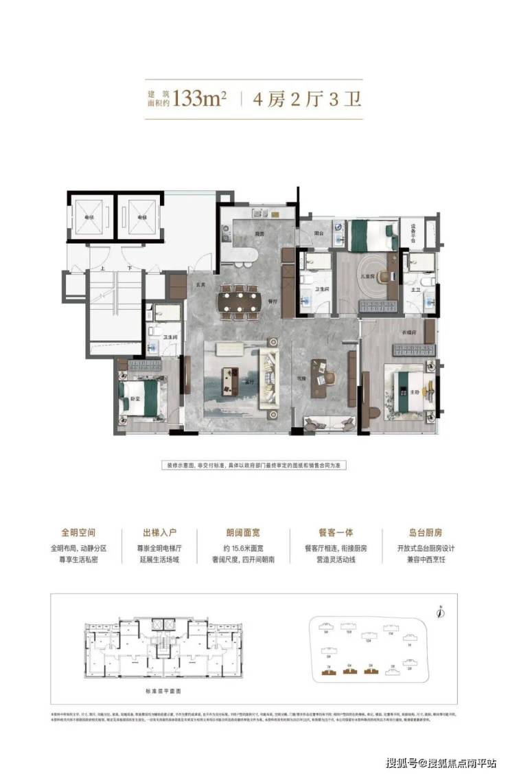 【全明空间】全明布局,动静分区,尊享生活私密【出梯入户】尊崇全明电梯厅,延展生活场域【朗阔面宽】约 15.6米面宽,奢阔尺度,四开间朝南【岛台厨房】开放式岛台厨房设计,兼容中西烹饪【套房双卧】南向双套房,独立卫浴,契合改善需求