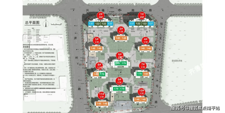 项目整盘均为四代宅设计,179㎡户型设置侧向、南向露台,其他户型为南向露台;外立面材质以涂料为主;高层层高3米,小高层为3.1米。