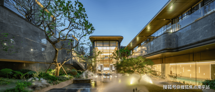 环形港湾之上,孤植一株造型独特的名贵罗汉松,四季常青,寓意守财、吉祥与长寿,彰显家族身份与尊贵;16口喷泉环绕,池心海棠纹树池巧妙融合古厝纹样与现代设计,一步一景,步步生花,尽显雅致与生机。