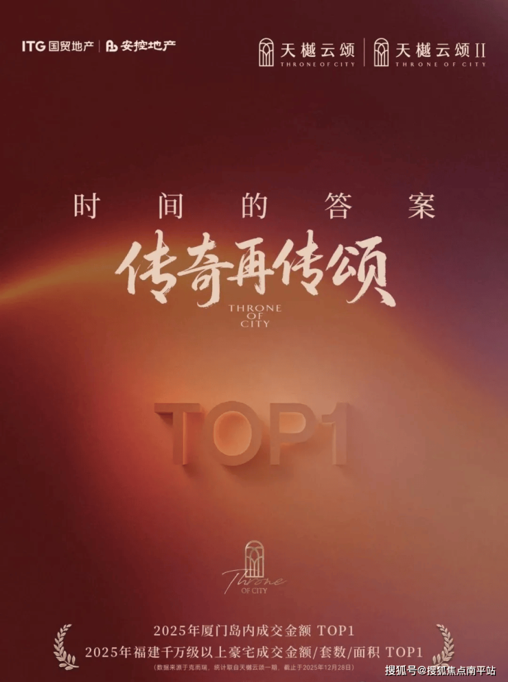 2025年堪称厦门豪宅元年,而天樾云颂一期横扫2025年豪宅榜单,成为2025年厦门岛内成交金额TOP1,更是2025年福建千万级以上豪宅成交金额/套数/面积TOP1。截至2025年底,项目以近30亿元的成交金额登顶厦门岛内单盘销冠。